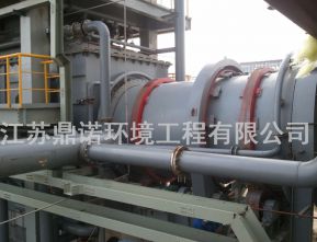采用重油、廢溶劑為加熱介質(zhì)。將在流化造粒塔生成的含有機(jī)物的混合污鹽加入回轉(zhuǎn)焙燒爐內(nèi)焙燒。在高溫下污鹽中的有機(jī)物氣化熱解。焙燒后的無機(jī)鹽外送綜合利用或填埋。焙燒產(chǎn)生的煙氣經(jīng)焚燒爐二次焚燒,將煙氣中有機(jī)物完全氧化成CO2、H2O、HCl、S